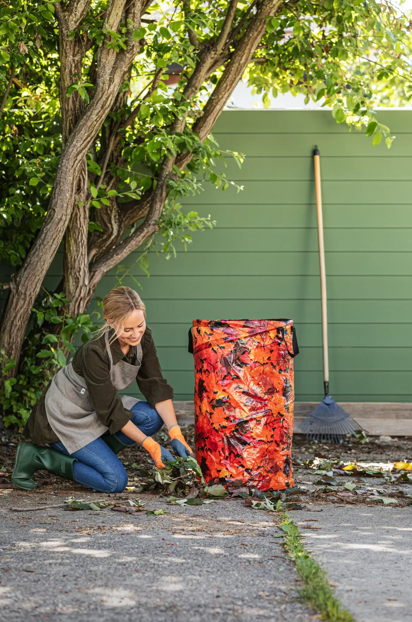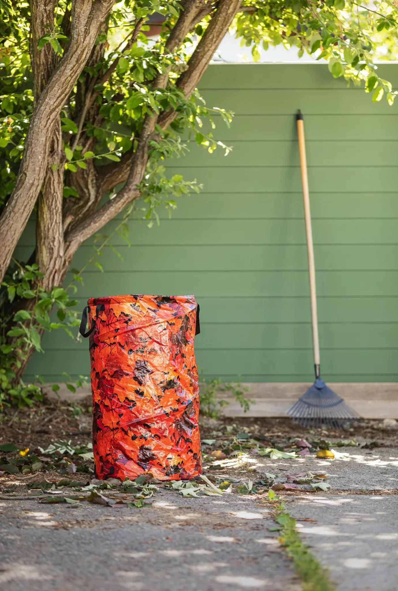 Dank der Pop-Up-Funktion stellt sich der Sack von selbst auf und kann jedes Jahr aufs Neue verwendet werden. Das orangefarbene Blättermotiv sorgt für einen bunten Hingucker im Garten und macht die Arbeit angenehmer und effizienter.