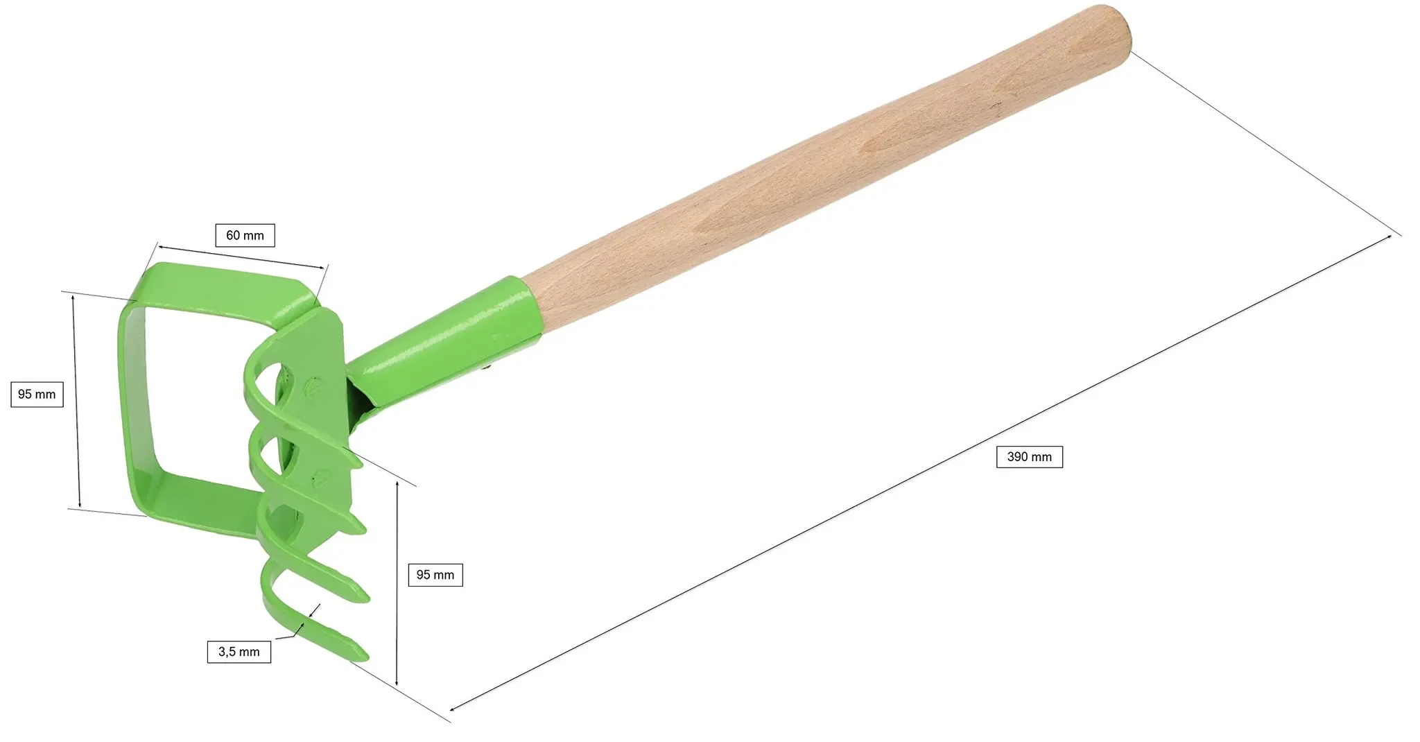 | Abmessungen | Gesamtlänge: 390 mm, Arbeitshöhe: 60 mm, Arbeitsbreite Rechen & Pendelhacke: 95 mm, Zinkenstärke: 3,5 mm |
