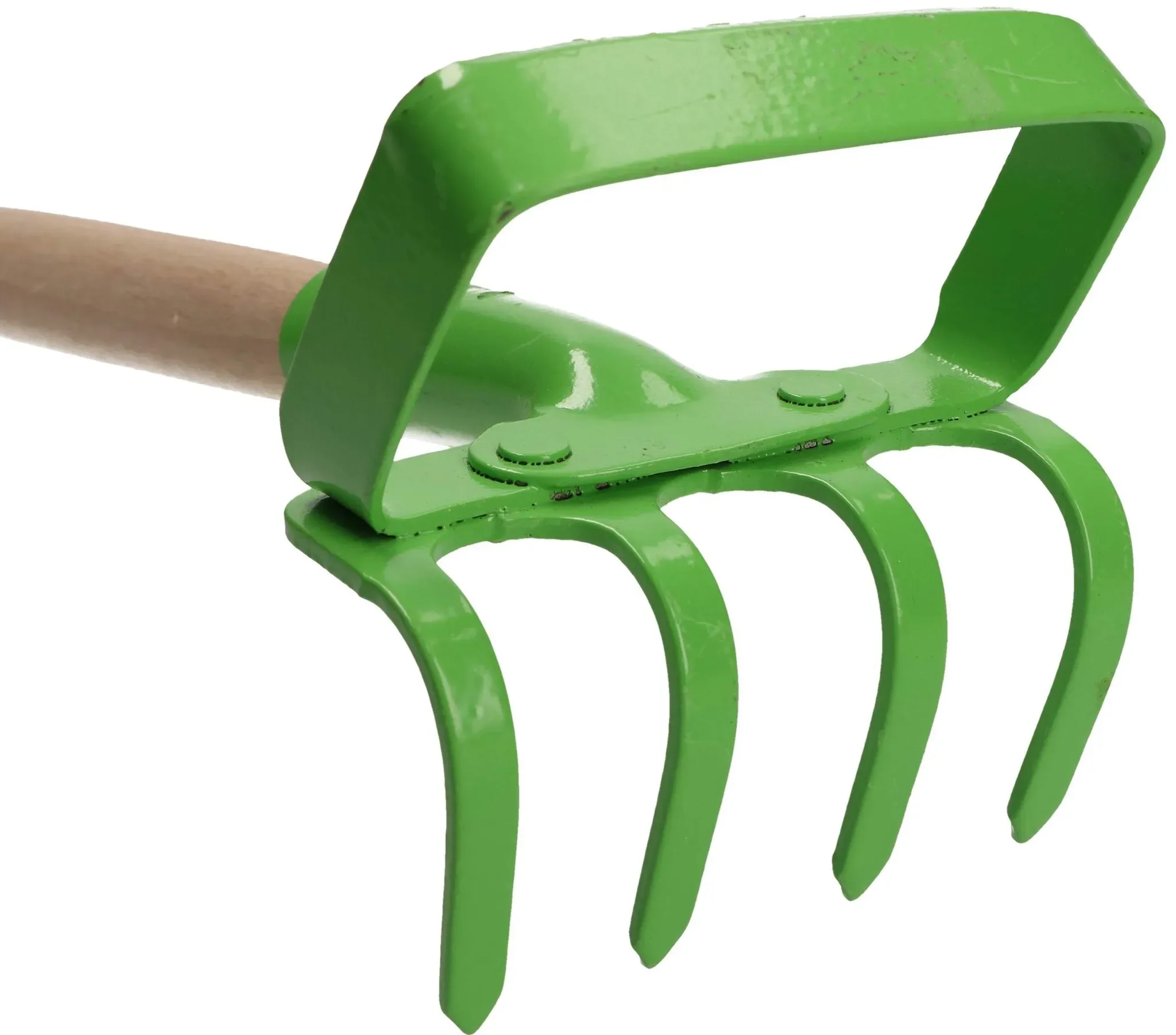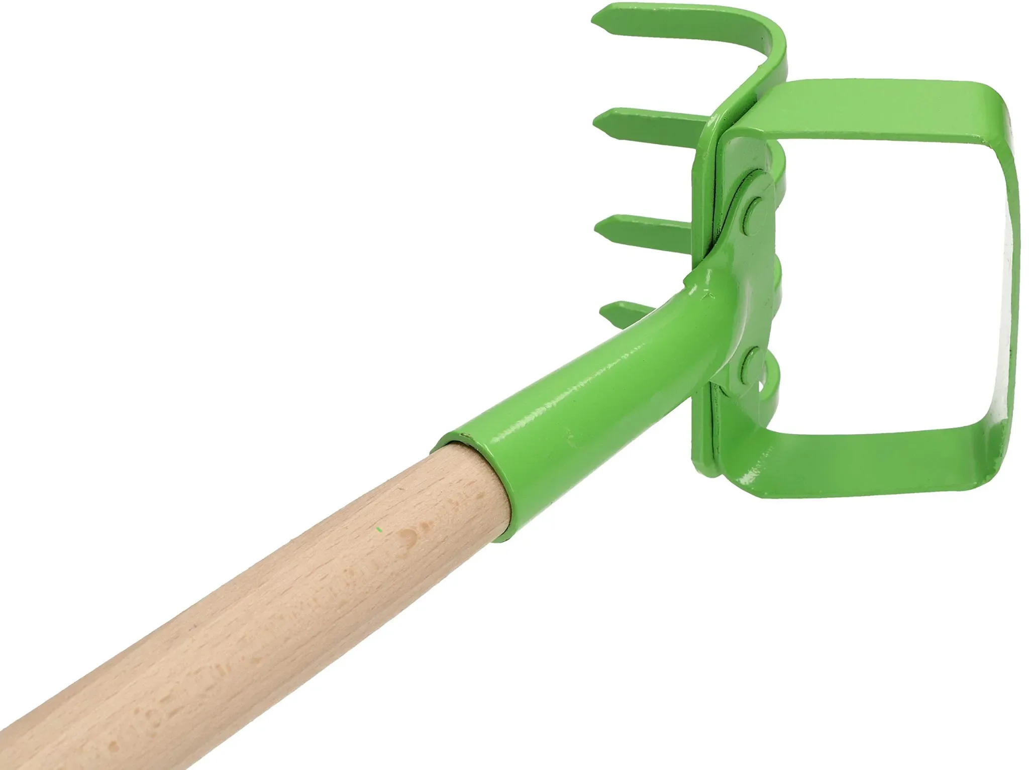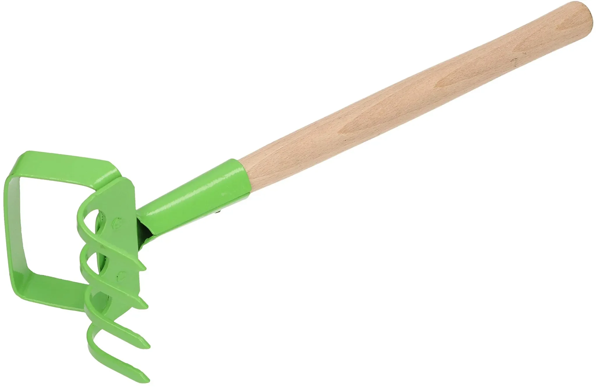 Der Arbeitskopf aus robustem, grün lackiertem Stahl ist abriebfest, widerstandsfähig gegen mechanische Belastungen und Feuchtigkeit. Der ergonomische Holzgriff sorgt für komfortables Arbeiten und präzises Handling, ohne umliegende Pflanzen zu beschädigen.